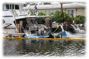 Shortly thereafter, TowBoatU.S. Ft. Lauderdale was contracted to perform the salvage operation and they mobilized their Sunken Vessel Recovery Unit to the scene; moments later one of the company's towboats and several salvage personnel also arrived. Salvage Master Kevin Collins dispatched the company's containment boom boat carrying 1600' of hard containment boom. Meanwhile, the crew deployed absorbent boom around the casualty in an effort to quickly mitigate any adverse environmental effects. Once the US Coast Guard Marine Safety team was satisfied with containment efforts, the salvage team worked methodically to stage all of the equipment necessary to undertake the salvage effort. Collins explained, "We included eight 6000lbs. lift bags, two 4000lbs. lift bags, four 4 inch diesel dewatering pumps as well as several gas powered dewatering pumps in our salvage plan. We also had to deal with a tremendous amount of chafe caused by the lifting chine on this particular vessel. We decided to use a combination of chains and hi tensile line to rig our lift bags to ensure each bag was rigged safely and securely, it worked perfectly!"