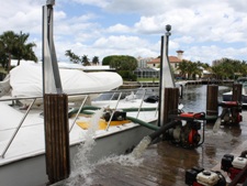 TowBoatU.S. Ft. Lauderdale received a report of an 82' Hatteras on fire behind a house in Ft. Lauderdale. Crews immediately responded via land and water. The vessel's fire was extinguished by Fire Rescue. TowBoatU.S. Ft. Lauderdale immediately deployed absorbent and containment boom to control pollution. The Salvage Team worked for two days to refloat the casualty and secure it for towing. The vessel was towed to a Marine facility in Ft. Lauderdale for emergency haul out.